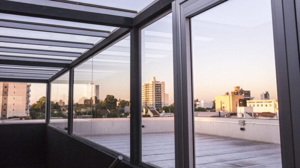La terraza posee un armazón estructural de frente integral con techo de vidrio laminado que permite disfrutar de una vista de la ciudad. En el cerramiento superior, se colocó una cenefa con estructura de acero y placas de alucobond color gris oscuro.