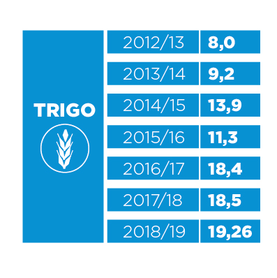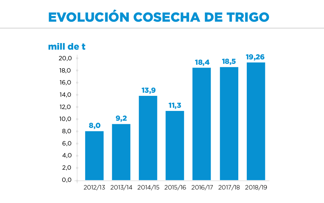 La Argentina conseguirá por tercer año consecutivo una cosecha récord de trigo. Así lo señala el informe mensual de estimaciones agrícolas que publicó la Secretaría de Gobierno de Agroindustria que muestra una producción récord de 19,26 millones de toneladas para la campaña 2018/2019, la mayor en la historia del país de ese cereal.