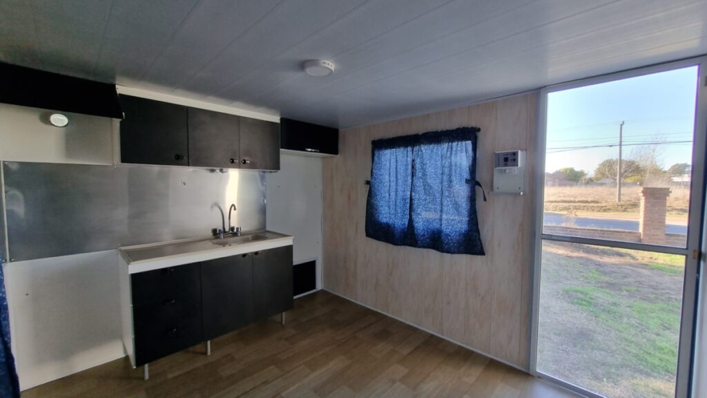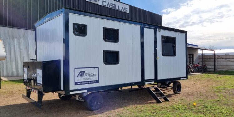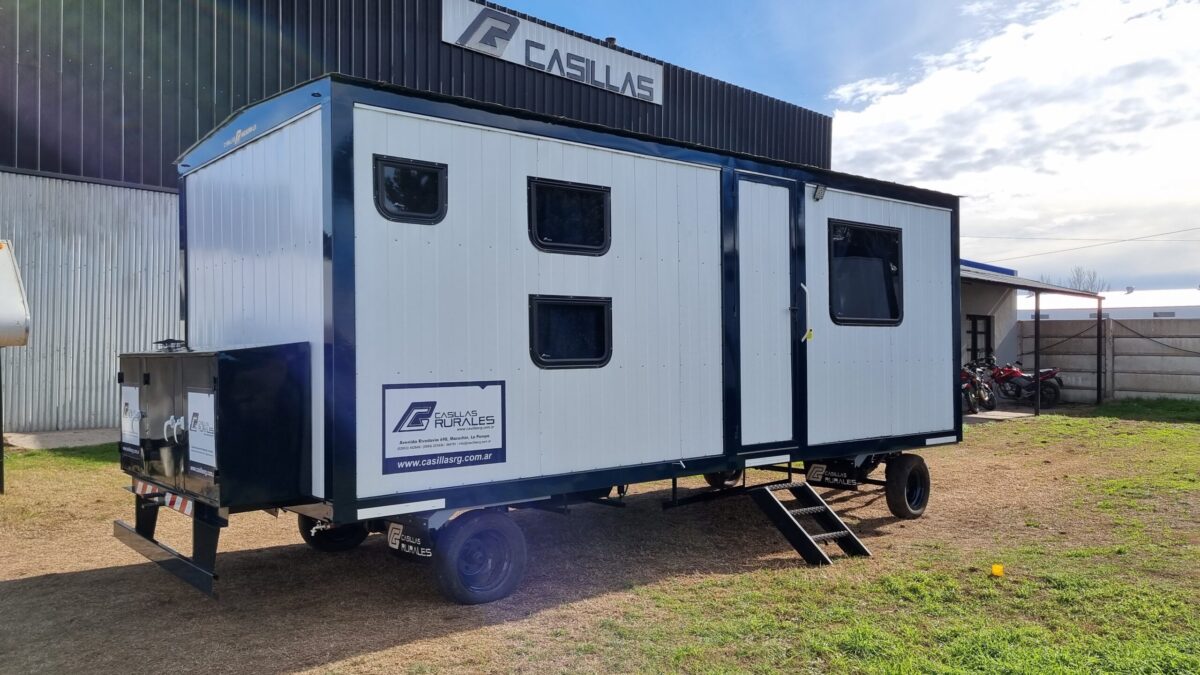 Es algo que hacemos un poco más personalizado. Son las que van arriba de las camionetas, de las doble cabina, por lo general. Es como una casilla que va arriba de la camioneta. Tienen sus cálculos hechos por ingenieros para que quede bien distribuido el peso sobre el eje trasero. Vienen equipadas con colchones y almohadones revestidos en cuero ecológico, ventanas levadizas de doble contacto con mosquiteros, una mesada de acero inoxidable con bacha y anafe incorporados, grifería de cocina y baño, un inodoro químico portátil, un calefón de encendido automático, un taque de aguas blancas, entre otras cosas, con la posibilidad de agregar una heladera a gas, tanques de aguas grises, un calefactor, un duchador externo y más.
