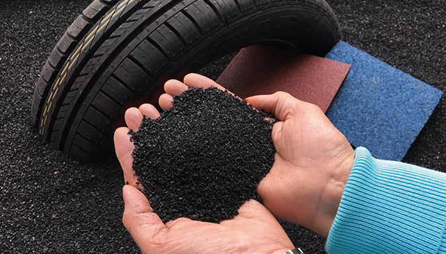 El granulado obtenido del procesamiento de los neumáticos se mezcla con arena y se coloca debajo de la alfombra de césped sintético para dar amortiguación y extender la durabilidad del pasto.