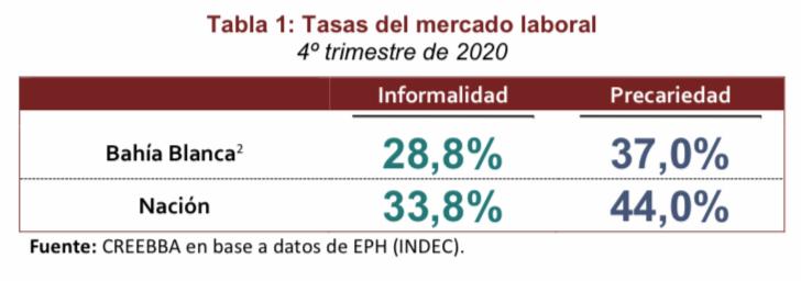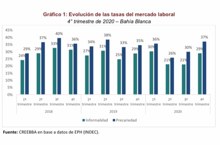 En la ciudad de Bahía Blanca, según los datos de la Encuesta Permanente de Hogares del INDEC (EPH), se estima que la tasa de informalidad alcanzó al cierre del cuarto trimestre de 2020 el 28,8% (lo que equivale a aproximadamente 27.800 personas), mientras que la tasa de precariedad se ubicó en 37% (aproximadamente 50.700 individuos). A nivel nacional, por su parte, la tasa de informalidad asciende al 33,8% mientras que la de precariedad fue del 44%, indicó la entidad en un nuevo informe.