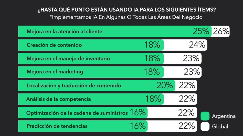 Frente a este panorama, las pymes encuestadas consideran que implementar tecnología y conseguir el talento adecuado ayuda a sortear mejor estos obstáculos. El 51 % expresó que la digitalización redujo las barreras para ingresar al mercado global y el 71 % afirmó que el ritmo del cambio tecnológico es un impulsor de innovación para su empresa. Las empresas de Argentina ya están usando Inteligencia Artificial para mejorar la atención al cliente, localizar y traducir contenido y perfeccionar el manejo de inventario.