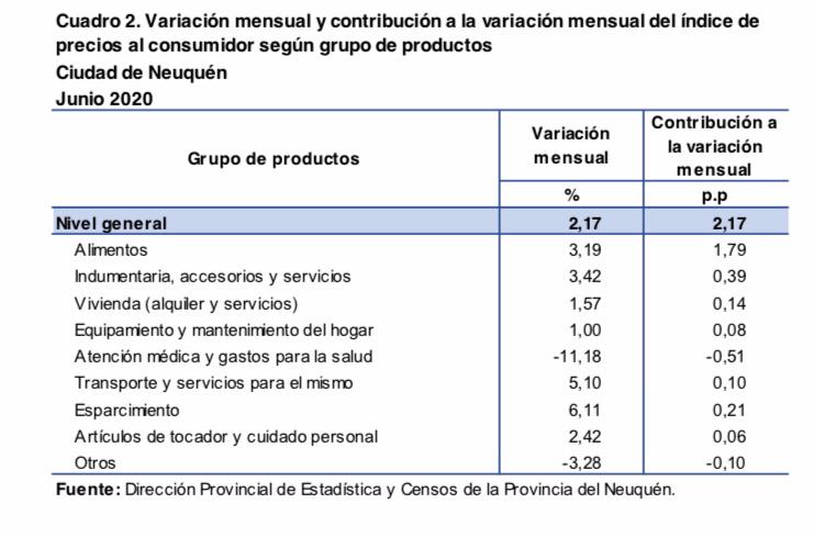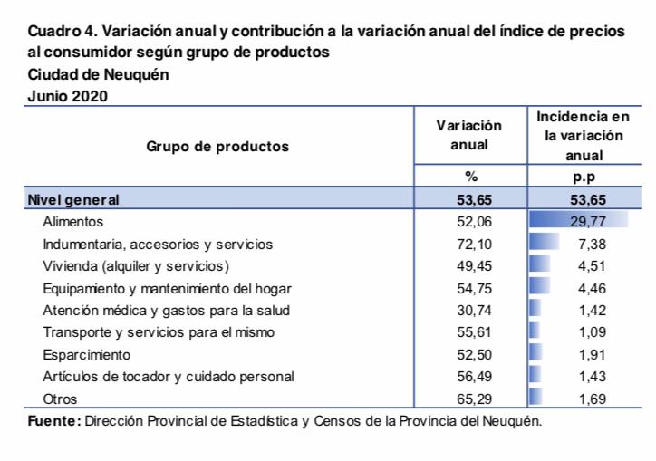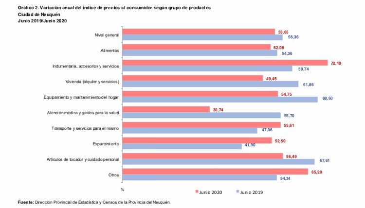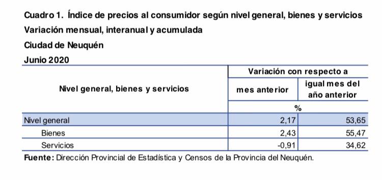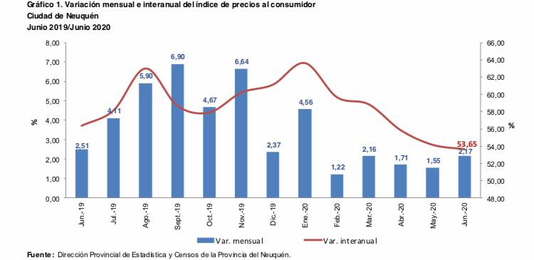 En junio el nivel general del índice de precios al consumidor de la ciudad de Neuquén se incrementó de 2,17% mensual y acumuló una suba de 53,65% con respecto a igual mes de 2019.