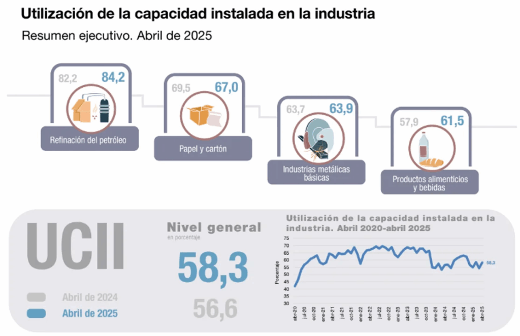 La utilización de capacidad instalada en la industria se ubicó en 58,3 % en abril, nivel superior al del mismo mes de 2024, cuando fue de 56,6 %, de acuerdo con lo informado hoy por el Instituto Nacional de Estadística y Censos (Indec).