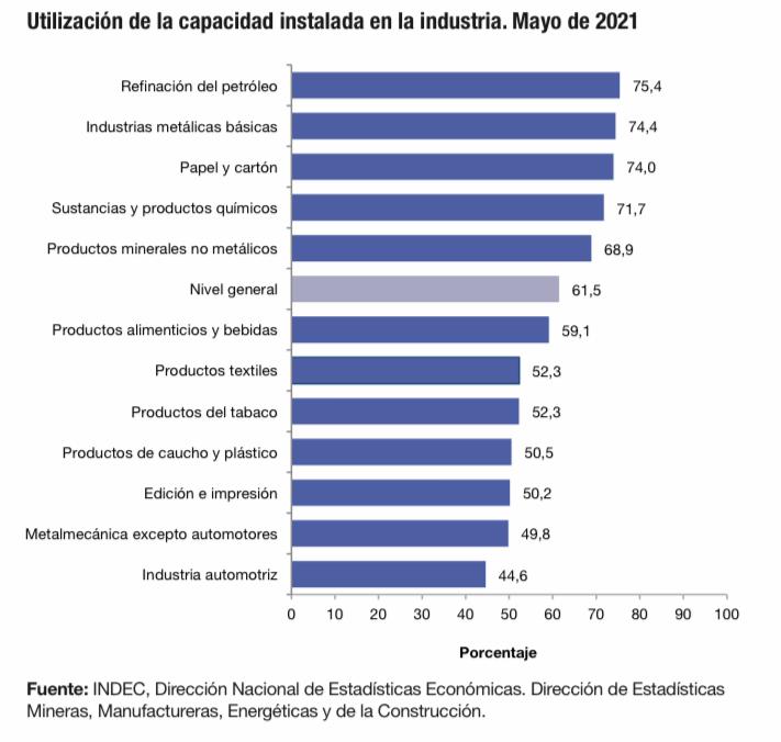 De acuerdo al organismo estatal, durante mayo de 2021 la utilización de la capacidad instalada en la industria se ubicó en 61,5%, nivel superior al del mismo mes de 2020, en el que se registró un 46,4%.