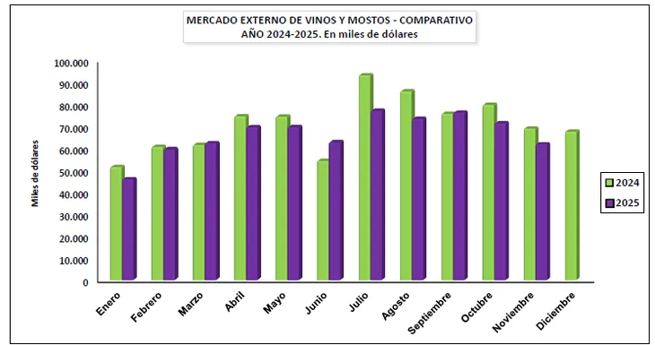 En el detalle por tipo de producto, el golpe llega parejo: los vinos fraccionados caen -5,7% en volumen, el granel profundiza la baja con -11,7%, y el vino tinto acumula un retroceso de -8,7%. El tinto, motor histórico de la exportación, queda en el centro de la preocupación.