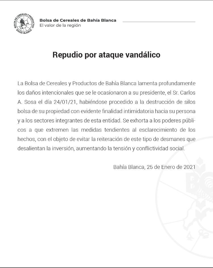 La Bolsa de Cereales y Productos de Bahía Blanca (Bcpbb) repudió hoy los daños que se registraron en dos silobolsas ubicadas en un establecimiento que es propiedad del presidente de la entidad, Carlos Sosa.