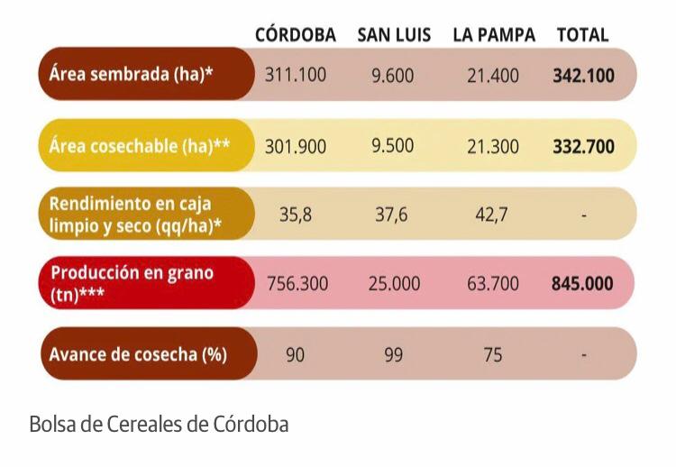 Si a estos valores se agregan los de las provincias de La Pampa y San Luis, la cosecha de maní proyectada por la Bolsa de Cereales de Córdoba es de 845.000 toneladas.