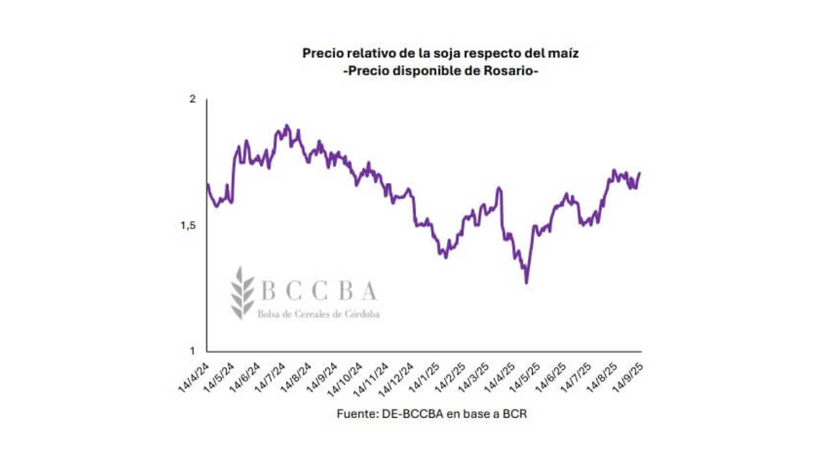 El análisis de la BCCBA muestra también un cambio en la relación de precios entre ambos granos: en abril, una tonelada de soja permitía comprar 1,3 toneladas de maíz. En septiembre, ese poder de compra escaló a 1,7 toneladas, es decir, una mejora relativa del 22% para la oleaginosa en apenas cinco meses. Esta diferencia en precios explica por qué los productores priorizaron las ventas de soja frente a un maíz que mostró subas interanuales pero quedó por debajo de los niveles de dinamismo habituales.