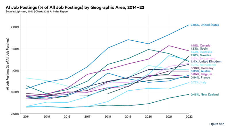 La cantidad de ofertas de trabajo relacionadas con la IA se incrementó del 1,7% en 2021 a 1,9% en 2022 y los entendidos en el tema proyectan que estará muy por encima del 2% en 2023. Los empleadores en los Estados Unidos cada vez buscan más trabajadores con habilidades relacionadas con esta especialidad.