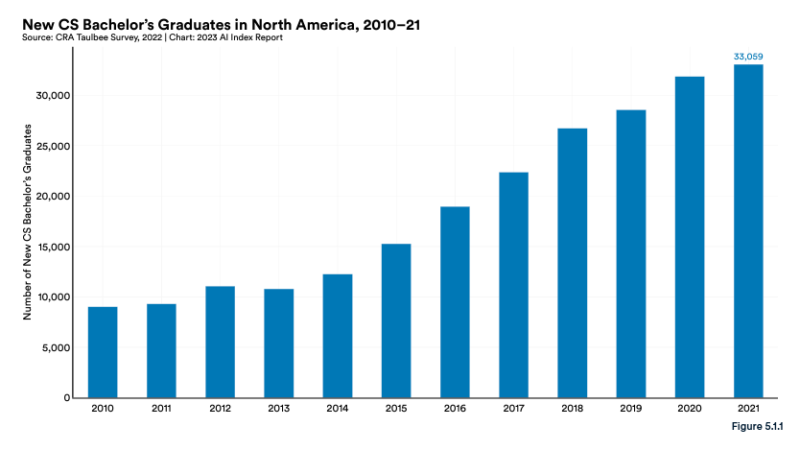La mayoría de los cursos relacionados con IA se ofrecen como parte de un plan de estudios de informática. En 2021, el número total de nuevos graduados de licenciatura en Ciencias de la Computación en Norteamérica fue de 33.059, cuatro veces más que en 2012.