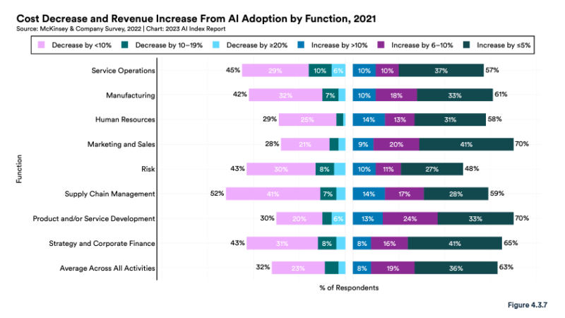 Entre las reducciones, elinforme detalla que logra un 52% en la Gestión de la cadena de suministro un 45% en Operaciones de servicios y un 43% en Estrategia y finanzas. En relación al aumento de ingresos, menciona: un 70% en Marketing y ventas, un 70% en Desarrollo de producto y un 65% en Estrategia y finanzas.