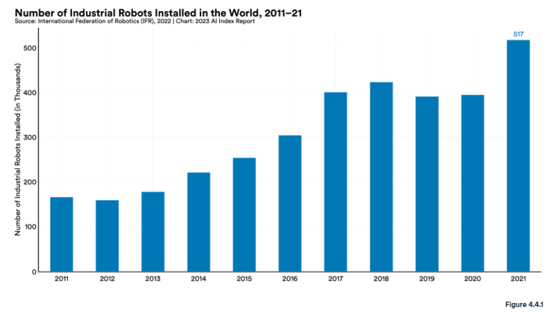 2021 vio un repunte en el número total de robots instalados en todo el mundo. En 2021 se incorporaron 517.000 robots industriales, lo que representa un incremento del 31,3% con respecto a 2020.
