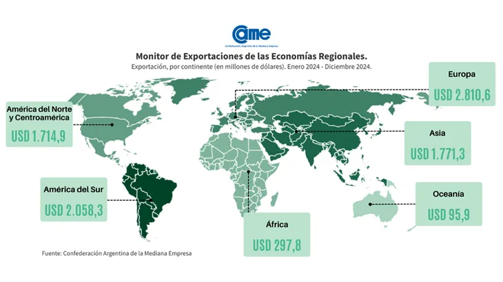 Con este incremento, las exportaciones regionales alcanzaron los 8.749 millones de dólares exportados en el período enero 2024–diciembre 2024, habiendo importado 2.004 millones, lo que arroja un superávit comercial de 6.745 millones de dólares.