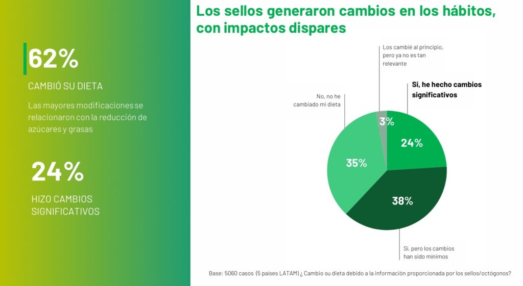 Frente a los cambios advertidos a partir de la ley por parte de las empresas, el 79% de los encuestados afirma que las marcas cambiaron sus estrategias de marketing, comunicación o packaging, pero solo 1 de cada 5 personas dice que cambiaron sus ingredientes, dejando como sensación, un cumplimiento obligatorio más que un compromiso genuino.