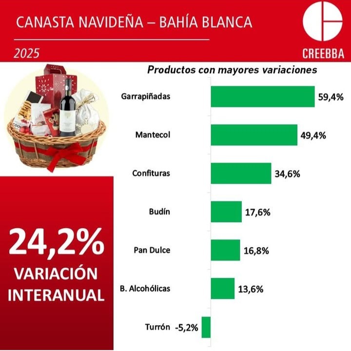 En la antesala de la Navidad, el consumo vuelve a ser el termómetro clave para leer el pulso económico de los hogares bahienses. La canasta navideña tradicional, muestra en 2025 una variación del 24,2 % respecto al 2024, según el relevamiento difundido por el Centro Regional de Estudios Económicos de Bahía Blanca (CREEBBA).