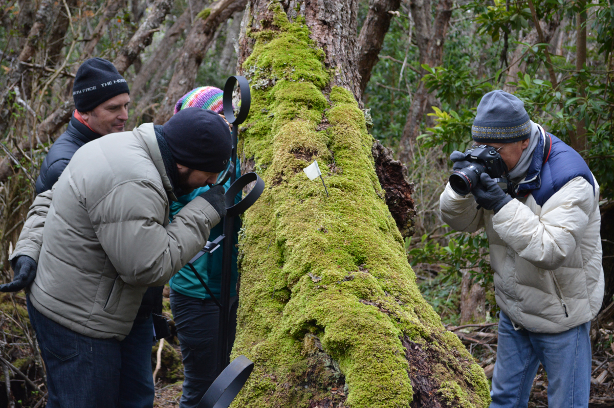 Con la vista en el suelo y una lupa en la mano, los científicos analizan pequeños musgos, líquenes y hongos que cubren la superficie boscosa de Omora. El calentamiento del clima se nota en estas latitudes (55 grados sur) de forma exponencial y esta diminuta flora reacciona buscando «temperaturas bajas», afirma Rozzi.