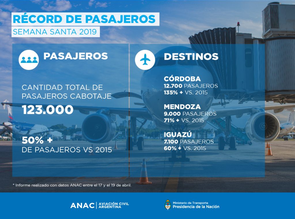 En el marco del plan ”La Revolución de los Aviones”, el sector aerocomercial continúa en expansión y las estadísticas que se registraron en este último fin de semana largo dieron muestra de ello, consolidando un récord en la cantidad de pasajeros. La cifra ascendió a 123 mil personas que viajaron en vuelos de cabotaje, lo que muestra un aumento del 50% respecto al registro del año 2015. Este récord de pasajeros representa un incremento del 2% respecto a la Semana Santa de 2018, que se desarrolló durante 5 días, un día más que este año.