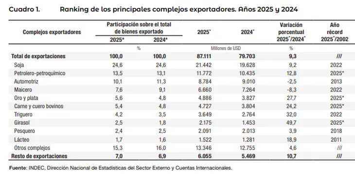 El complejo maicero apareció en cuarto lugar y también perdió peso versus 2024 (7,6% contra 9,1%). Por el contrario, el rubro de oro-plata afianzó su posicionamiento en el quinto escalón, con una mejora anual (5,6% en 2025 contra 4,8% en 2024).
