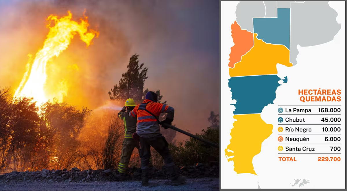 Las cifras reflejan la magnitud del desastre: La Pampa 168.000 hectáreas, Chubut 45.000, Río Negro 10.000, Neuquén 6.000 y Santa Cruz 700. En total se calculan que son 229.700 hectáreas quemadas, un escenario crítico.