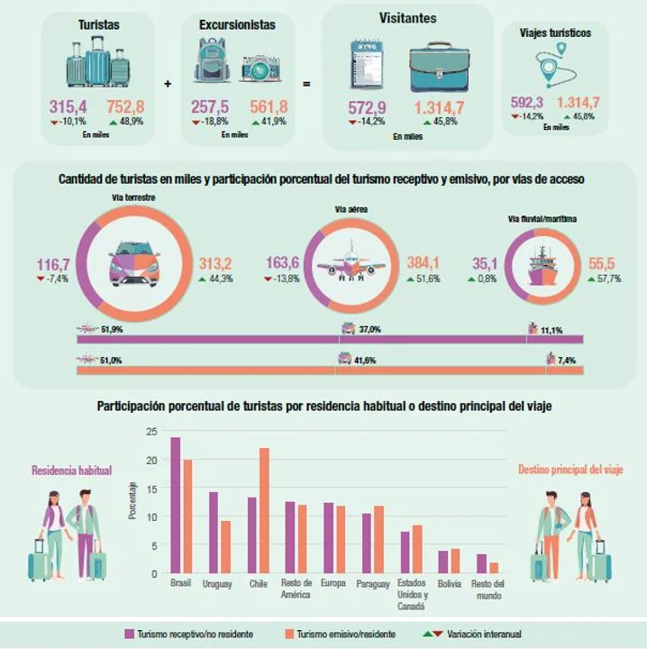 Durante el quinto mes del año, ingresaron un total de 572.900 visitantes no residentes, de los cuales 315.400 fueron turistas y 257.500 excursionistas. Dentro de los turistas que visitaron el país, el 23,7 % provino de Brasil, seguido por Uruguay (14,1 %) y Chile (13,2 %).