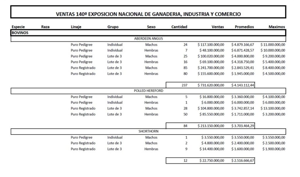 Las ventas de la Exposición Nacional de Ganadería, Comercio e Industria de la Sociedad Rural de Bahía Blanca, que se desarrolló entre el jueves 3 y el lunes 7 de octubre, totalizaron 1.036.020.000 pesos. 967.520.000 pesos correspondieron a la venta de bovinos y 68,5 millones de pesos a la venta de ovinos.