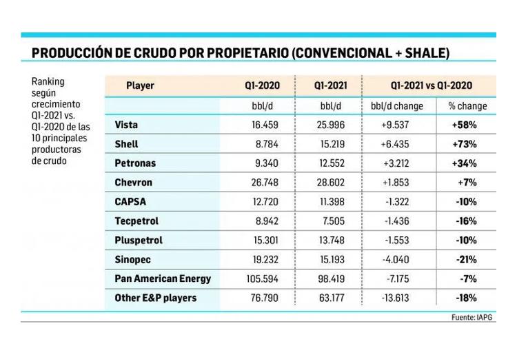 Así lo mostró un informe del Instituto Argentino de Petróleo y Gas (IAPG). La petrolera Vista logró las cifras más altas, al aumentar su producción en un 58% interanual en la formación neuquina.